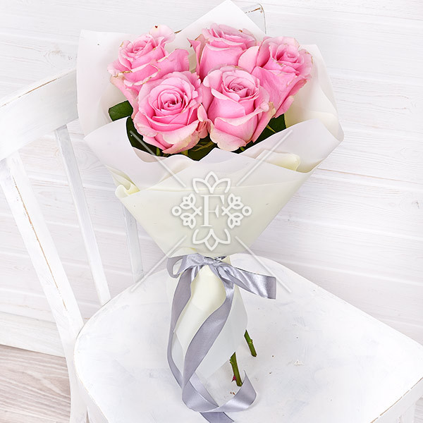 роза розовая – 5 шт., упаковка, лента.