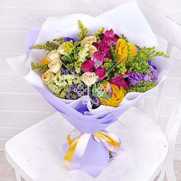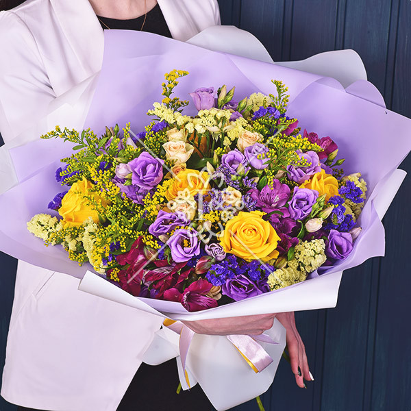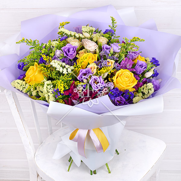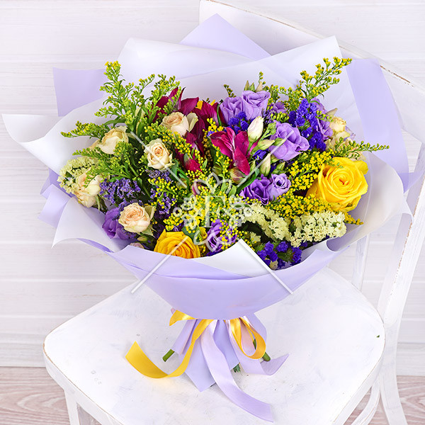 роза желтая – 3 шт., роза желтая кустовая – 1шт., эустома фиолетовая – 2 шт., альстромерия фиолетовая – 1 шт., статица желтая, фиолетовая – 3 шт., зелень декоративная: солидаго, лимомиум фиолетовый, упаковка, лента.